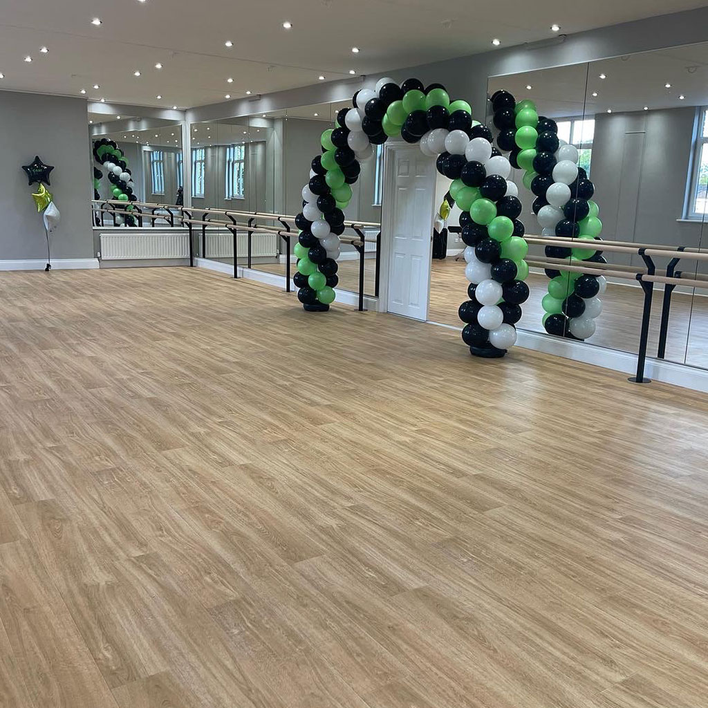 Harlequin Fiesta is a vinyl performance floor with a clear surface wear layer on top of an oak effect printed film. It looks exactly like a wood dance floor but avoids the cleaning and maintenance problems associated with traditional wooden floors.