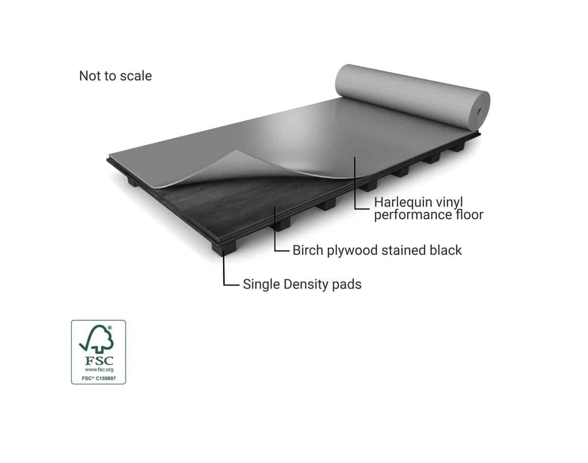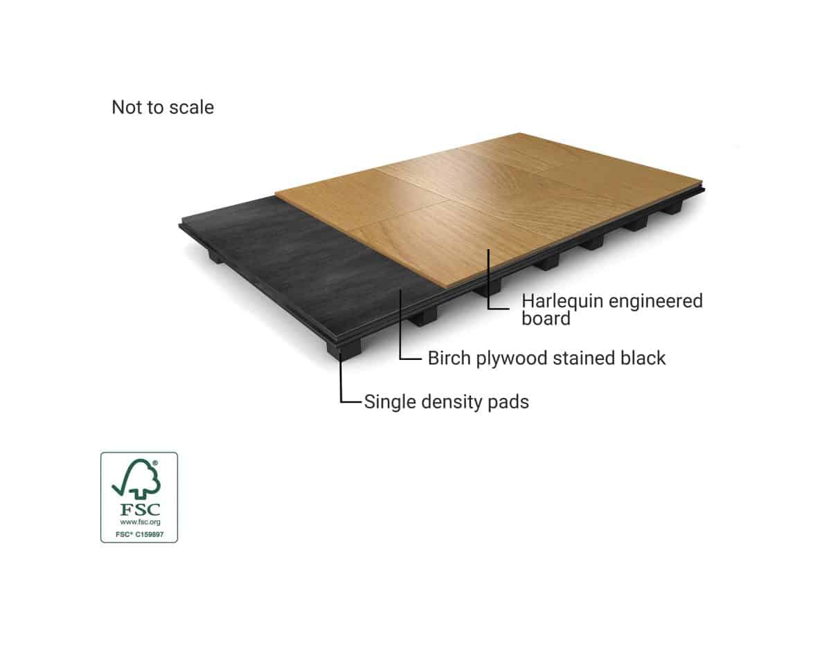 Harlequin Flexity is a self-install sprung floor system featuring stained birch plywood panels and shock-dampening single density elastomer pads.