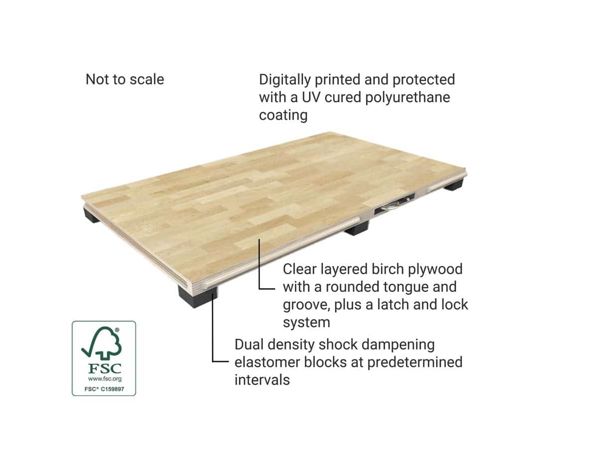 Performance surface: Harlequin Liberty Ballroom has a printed wood effect surface which is protected using a hard-wearing lacquer. Bespoke designs are available on request. Edge trims and ramps can be provided if required. For easy storage and transportation please see Harlequin’s panel cart.