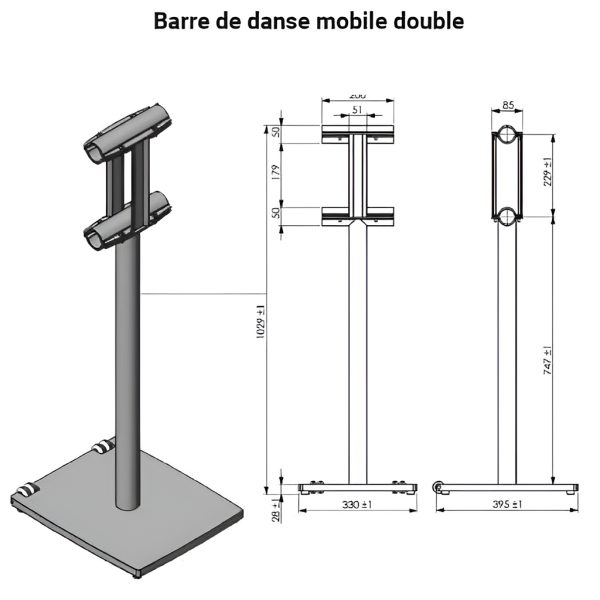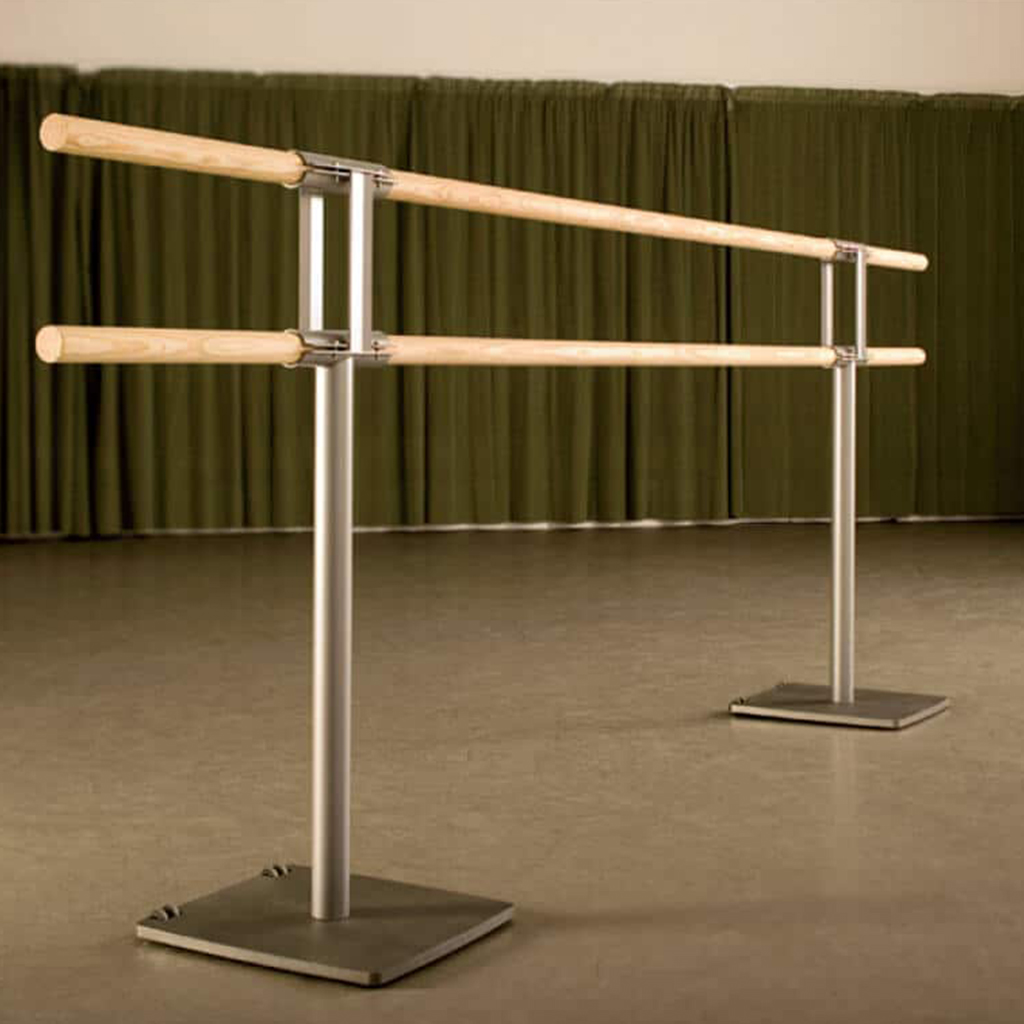 La barre de danse mobile double Harlequin pour professionnels consiste en deux barres en pin de 3m montées sur des poteaux et socles en acier. La construction est très robuste et inspire confiance au danseur.